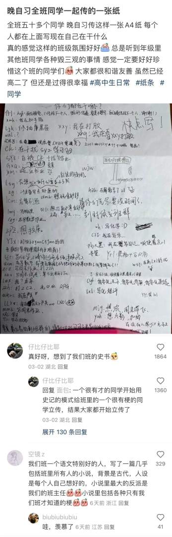 晚自习全班同学一起传的纸条。
