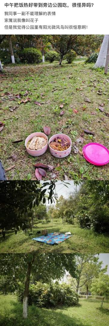 上班的中午把饭带到公园吃。